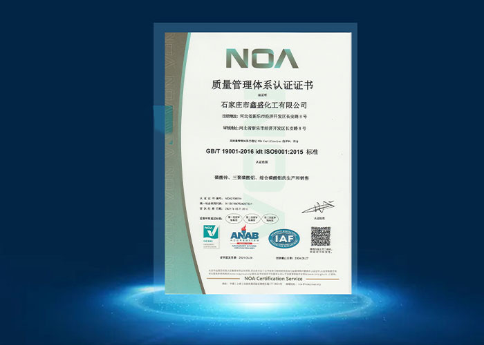 Η Xin Sheng αναγνωρίστηκε ως "Επιχείρηση υψηλής και νέας τεχνολογίας", "Μικρές και μεσαίες επιχειρήσεις της επαρχίας Hebei με βάση την επιστήμη και την τεχνολογία","Ειδικευμένες και εξειδικευμένες νέες επιχειρήσεις" και άλλες προηγμένες επιχειρήσειςΗ εταιρεία διαθέτει ισχυρή ομάδα έρευνας και ανάπτυξης, τέλειο εξοπλισμό δοκιμών, πλούσια εμπειρία στην παραγωγή αντιδιαβρωτικών χρωστικών προστασίας του περιβάλλοντος, επαγγελματική γραμμή παραγωγής φωσφορικών,επικαλούμενος την προχωρημένη αντίδραση, ξήρανση, θρυμματισμό, πλήρωση και άλλα εξοπλισμούς, για να επιτευχθεί υψηλής τεχνολογίας εξοπλισμού αυτοματισμού, την ευφυΐα της παραγωγής, τα πρότυπα παραγωγής είναι πιο αυστηρά, η διαδικασία είναι πιο εκλεπτυσμένη,η απόδοση της αντιβροχυντικής αντιτριβικής χρωστικής είναι πιο άριστηΗ ετήσια παραγωγική ικανότητα είναι 3000 τόνοι σειράς φωσφορικού ψευδαργύρου, 3600 τόνοι σειράς τριπολυφωσφορικού αλουμινίου και 1500 τόνοι σειράς φωσφορικού αλουμινίου.Έχουμε τρία κύρια συστήματα πιστοποίησης (ISO9001, ISO14001, ISO45001), οι οποίες είναι σύμφωνες με την πιστοποίηση της Ευρωπαϊκής Ένωσης REACH, τις απαιτήσεις του προτύπου ROHS, τις δοκιμές SGS.Τα προϊόντα μας πωλούνται σε όλη τη χώρα και εξάγονται στο εξωτερικό., εξάγονται στη Νοτιοανατολική Ασία και την Ευρώπη.